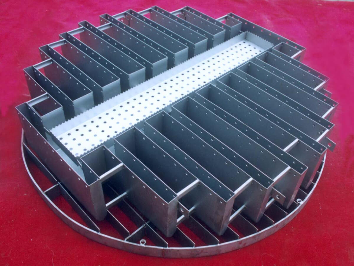 槽式液体分布器分为二级槽式液体分布器及单级槽式液体分布器,槽式液体分布器为重力型液体分布器,由于它靠液位(重力)分布液体,易于达到液体分布均匀及操作稳定等要求,具有操作弹性大,分布均匀度高等优点。