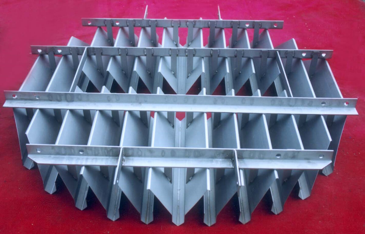 遮板式液体收集器是一种置于填料层下面,用来收集塔内分布均匀度已经达不到要求的液体,以便再分布或侧线采出的装置。它可以将液体全部收集,且阻力可以忽略不计,对气体分布的均匀性影响不大。